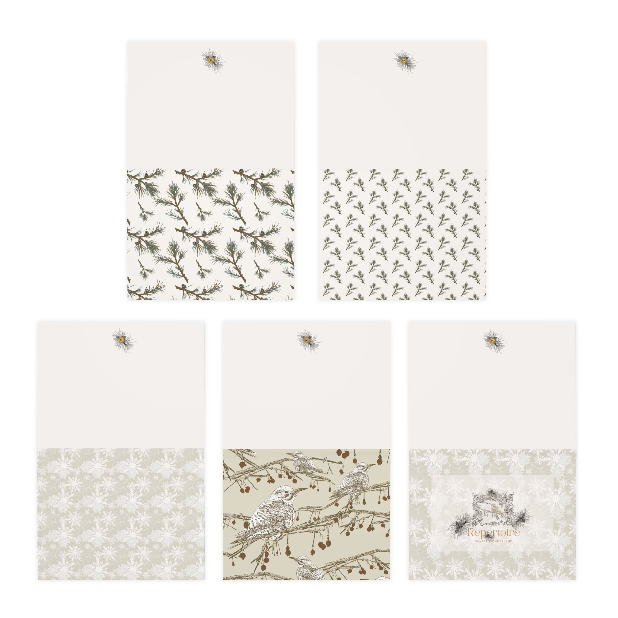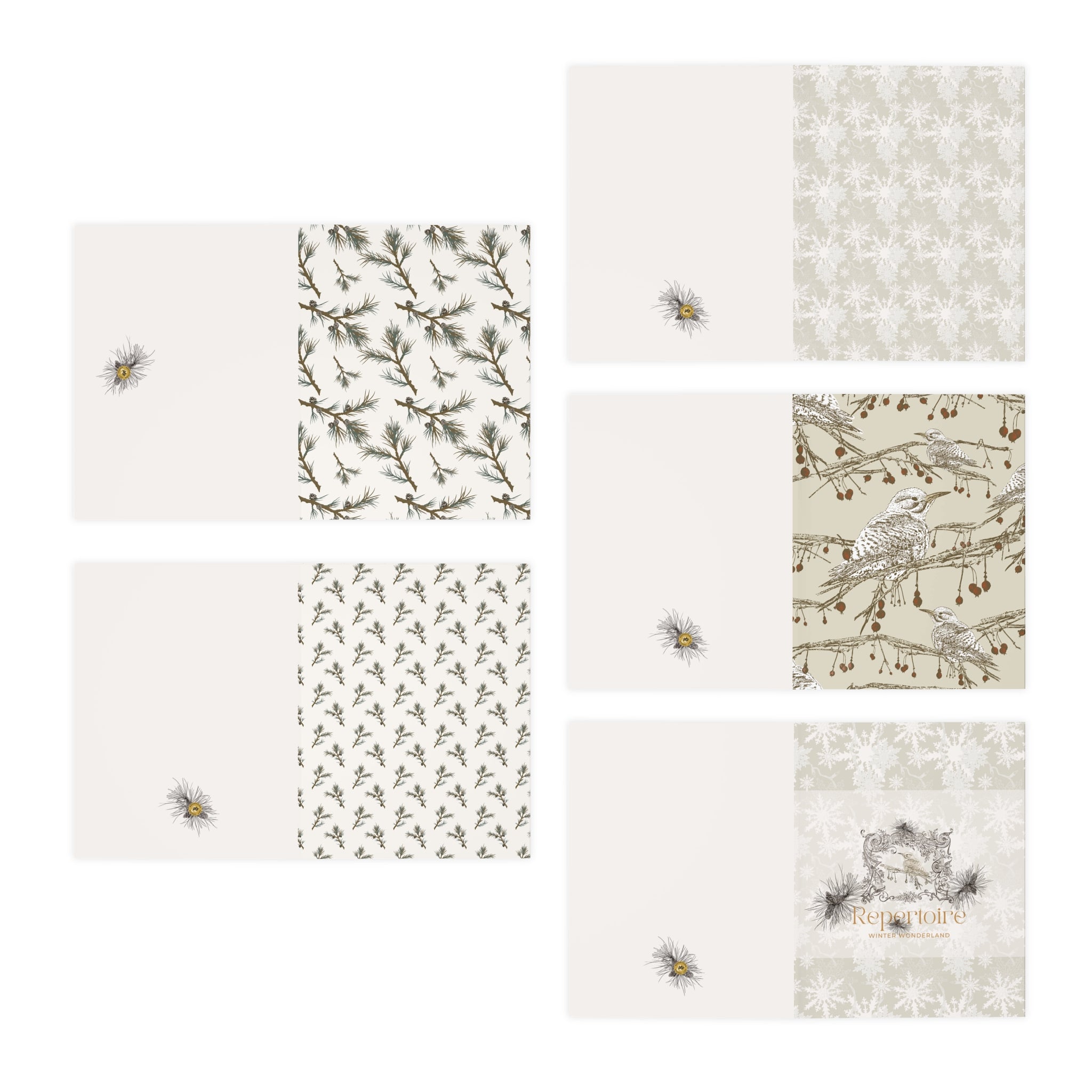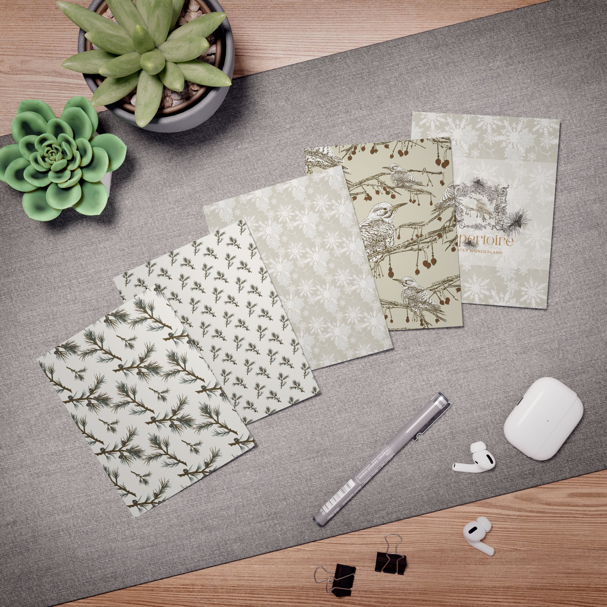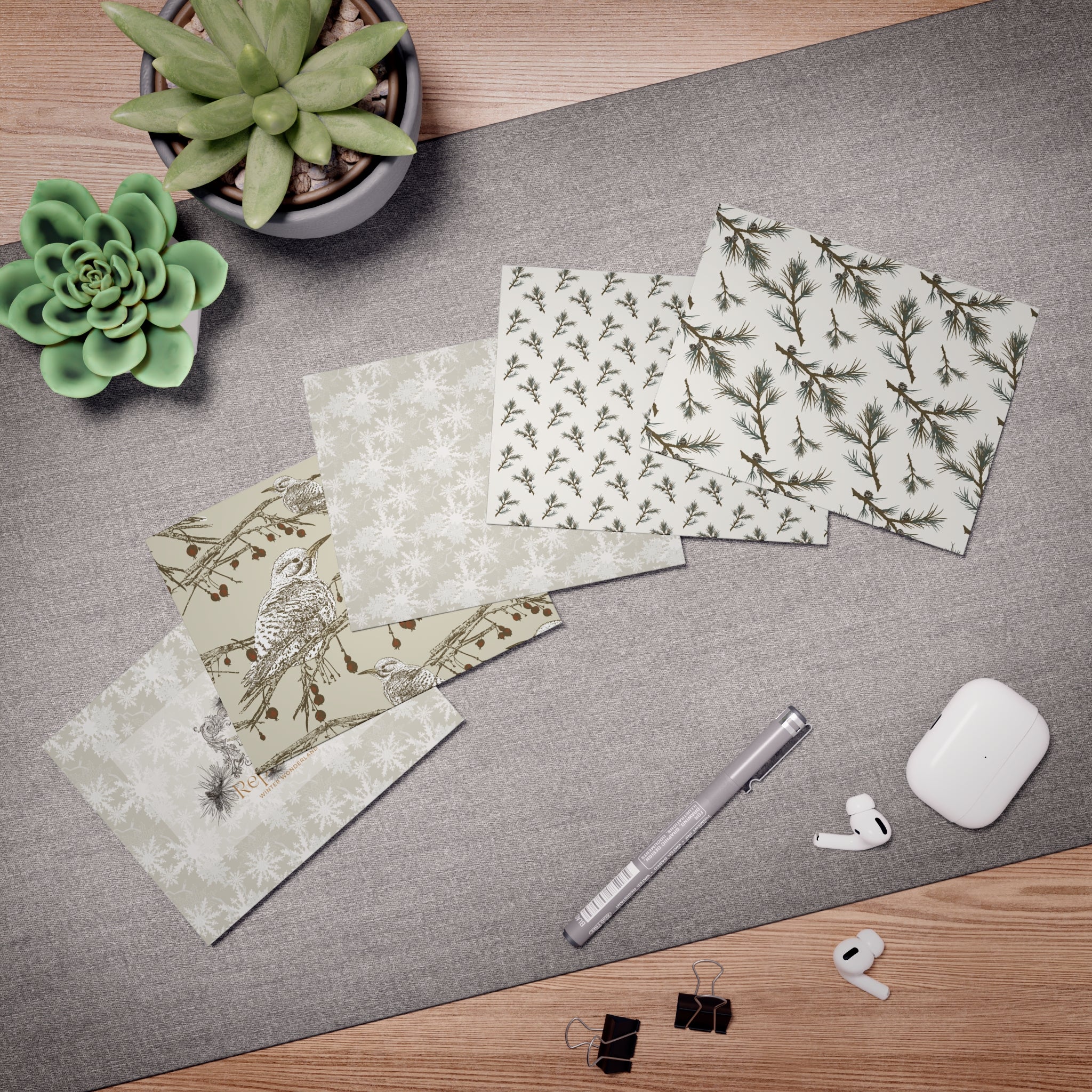 A set of five artisanal greeting cards that bring a quiet, woodsy mood to every note you send. Each card features delicate, nature-inspired illustrations — pine sprigs, tiny sprigs of foliage, a perched songbird, and soft snowflake patterns — all printed in warm, muted tones on heavyweight uncoated paper. The tactile, uncoated finish and crisp, vibrant inks make each design feel handcrafted and intimate. Sized to tuck into a pocket or layer inside a gift, these cards arrive with matching white envelopes and are assembled in the USA. Use them to write short, heartfelt messages for holiday moments, cozy notes to friends, or thoughtful thank-yous that carry a gentle, outdoorsy charm.