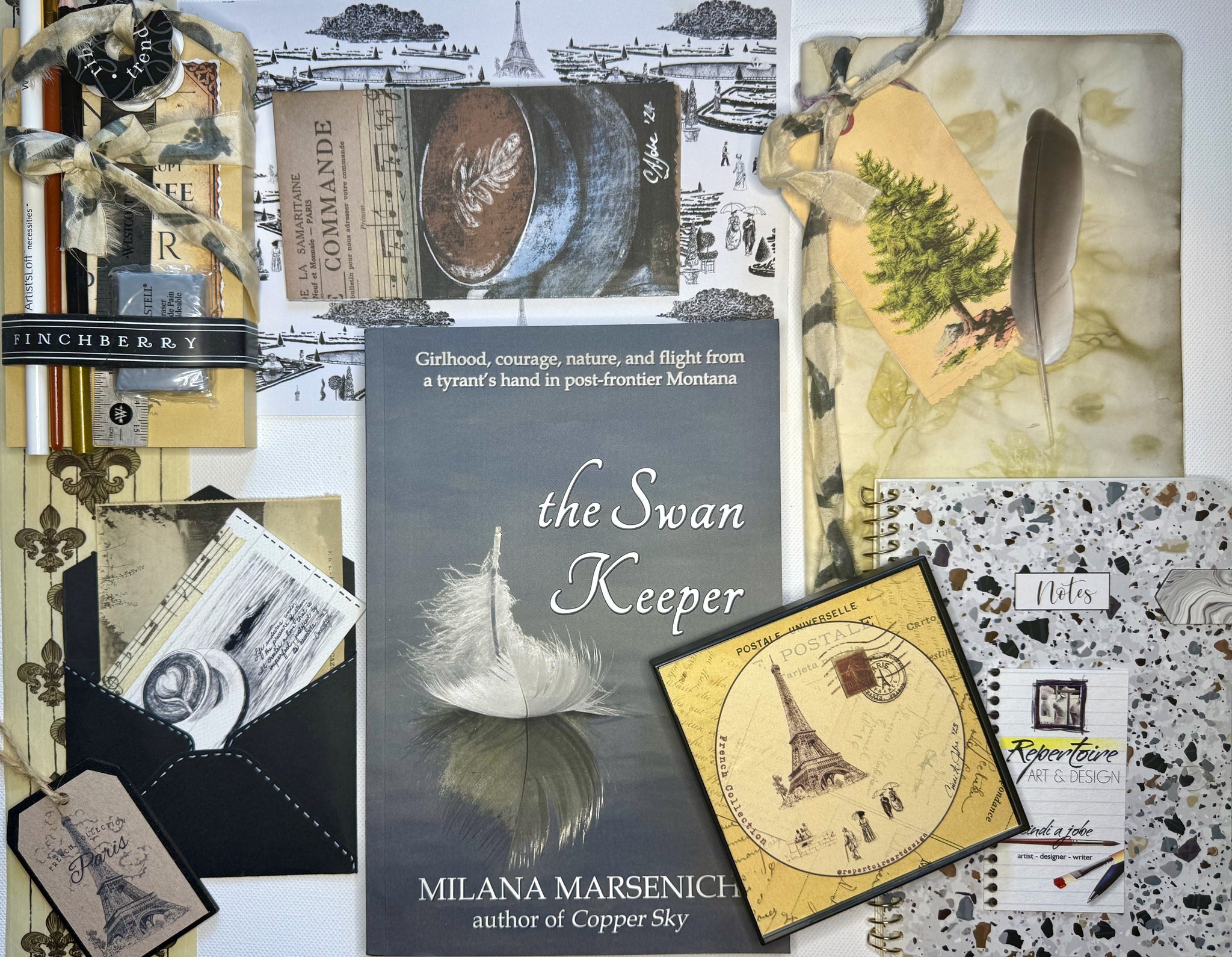 Choose "Pathways" from a selection of uniquely curated journal groupings by artist Cindi A. Jobe for yourself or for gifting. This selection is a unique combination including an inspirational book written by local Montana writer, Milana Marsenich called The Swan Keeper. Two blank journals for writing and sketching, gift cards, bookmarks, art supplies, and a repurposed gift box, all with mini surprises inside including a super cute gift card envelope, a vintage French postcard, and a framed art print by Cindi will keep you coming back to write and share more.